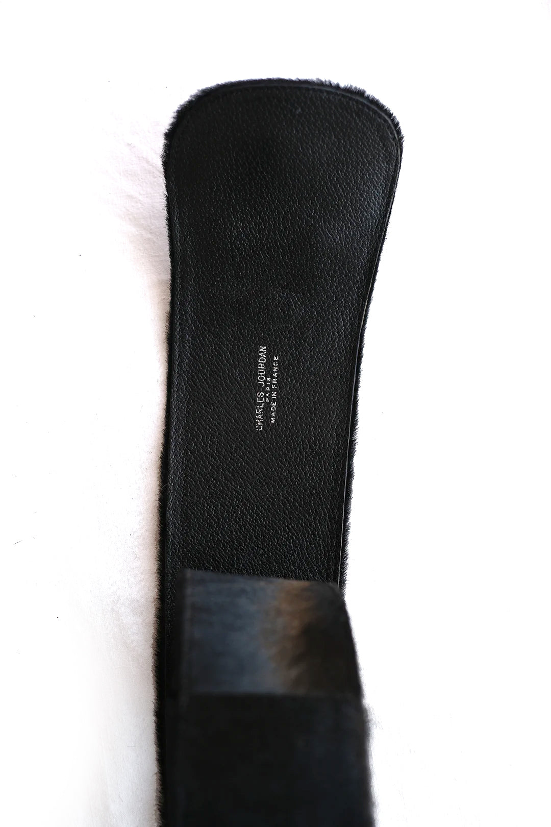 Large cowhide belt with silver metal buckle to be worn on the hips c.1990