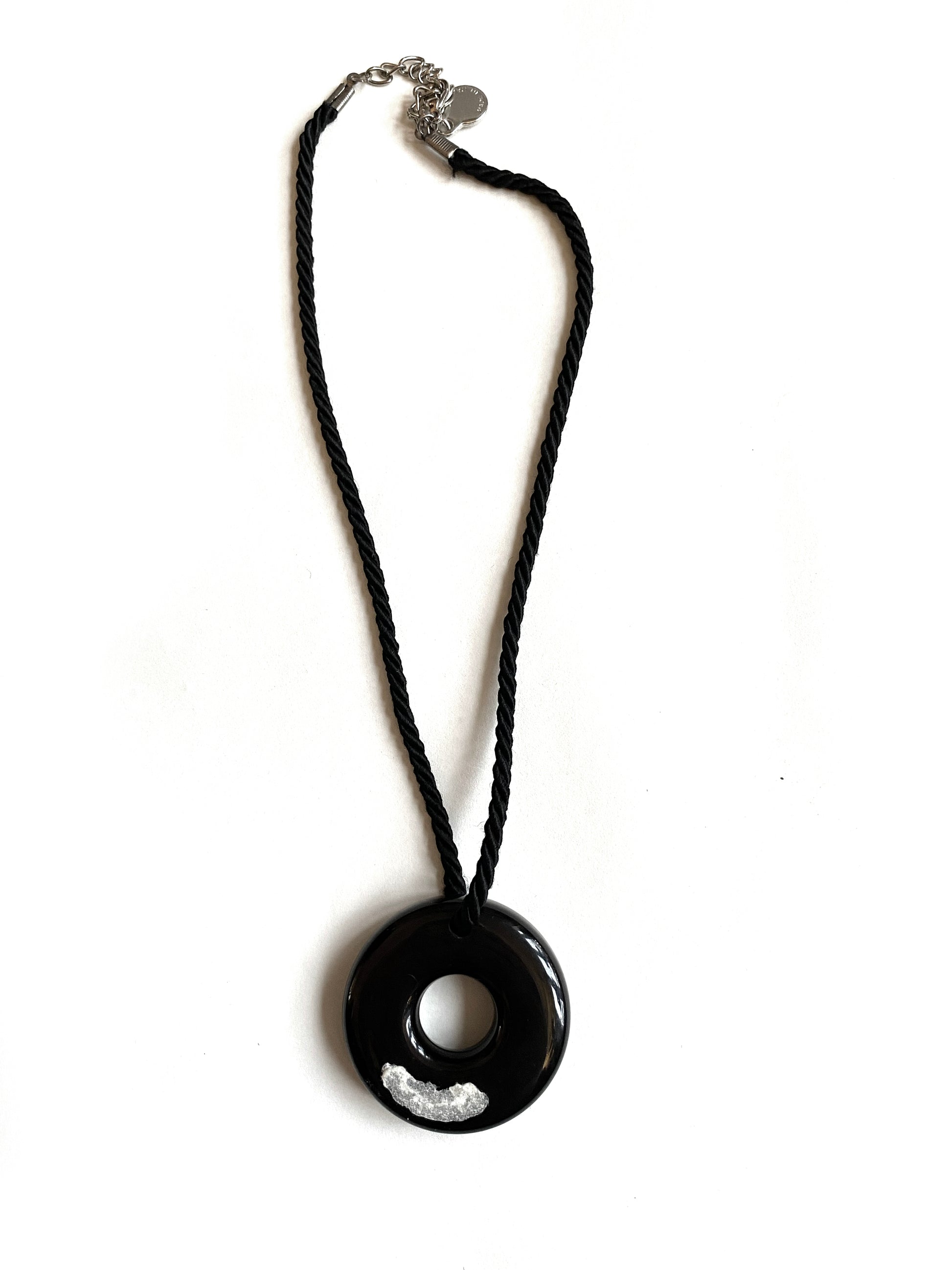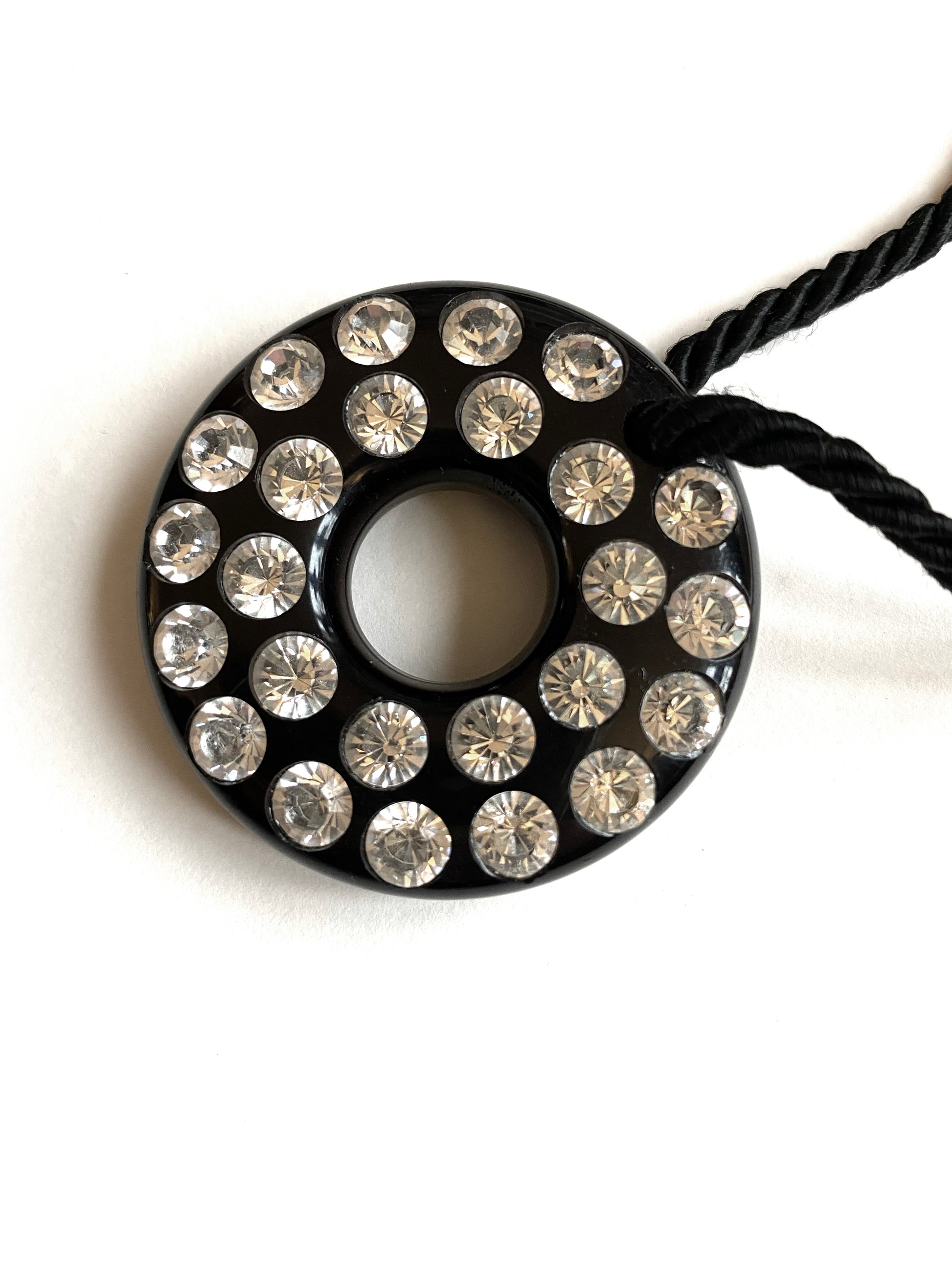 Cord necklace with a round resin and rhinestone pendant, circa 1985.