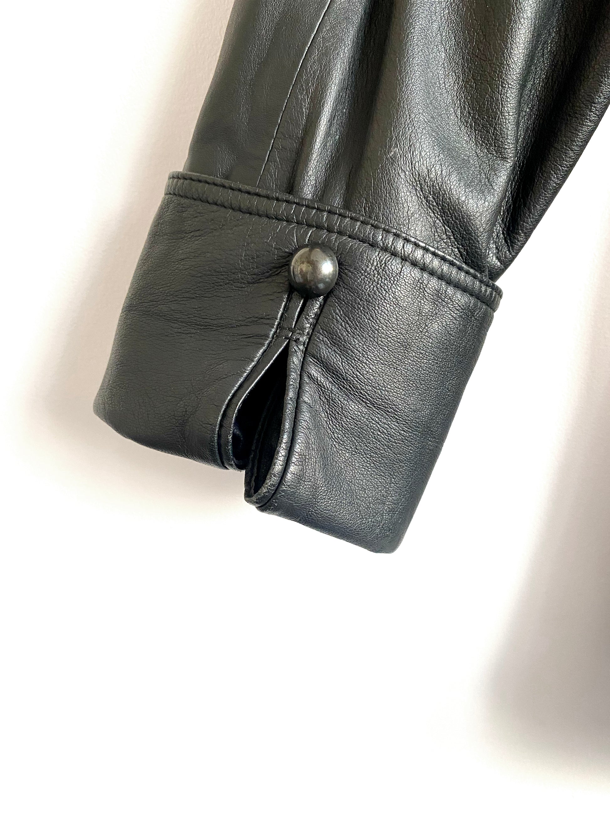 Military styled black leather and velvet long jacket, turn-back cuffs with buttonhole, two lower piped pockets, 1983.