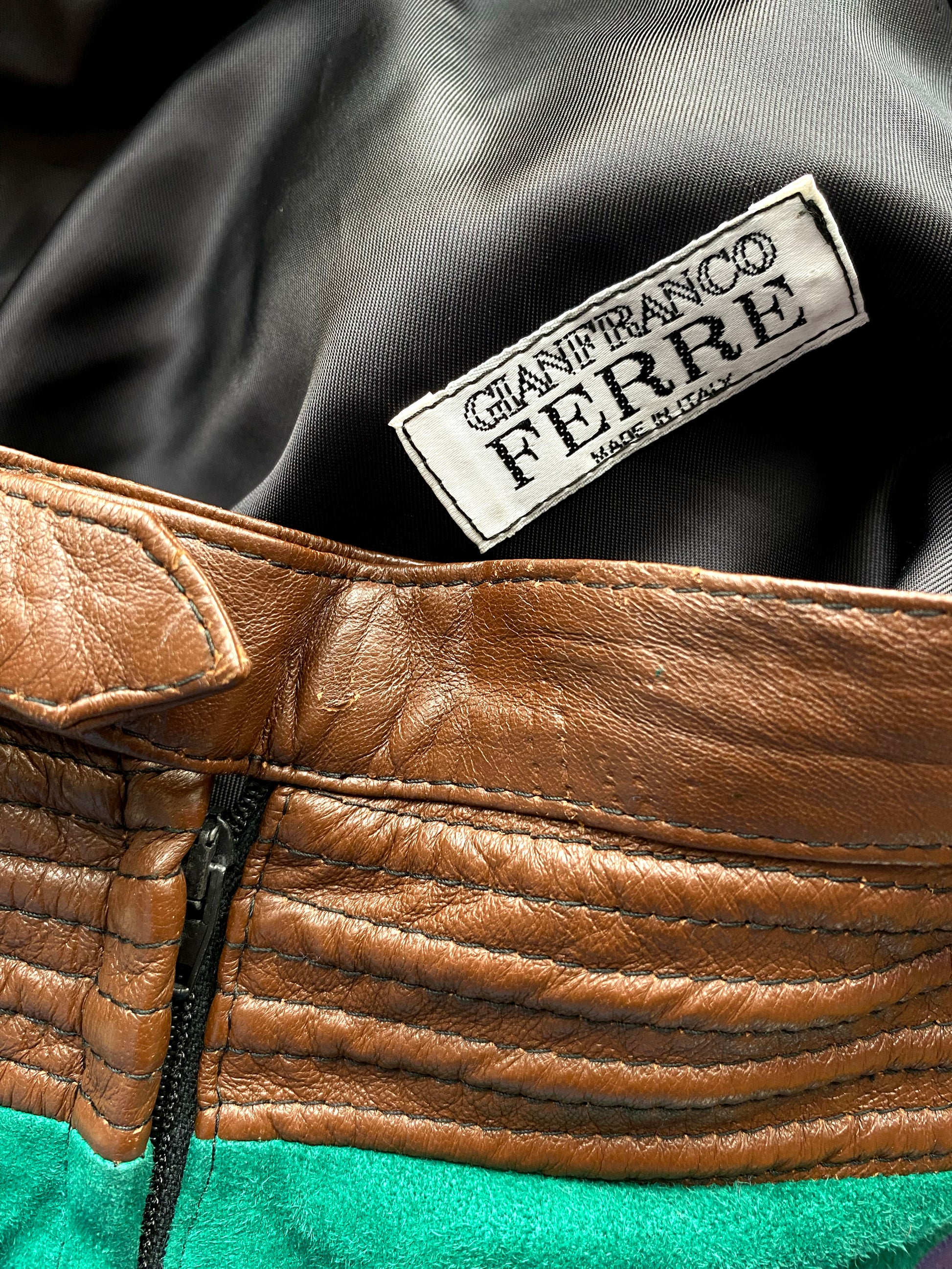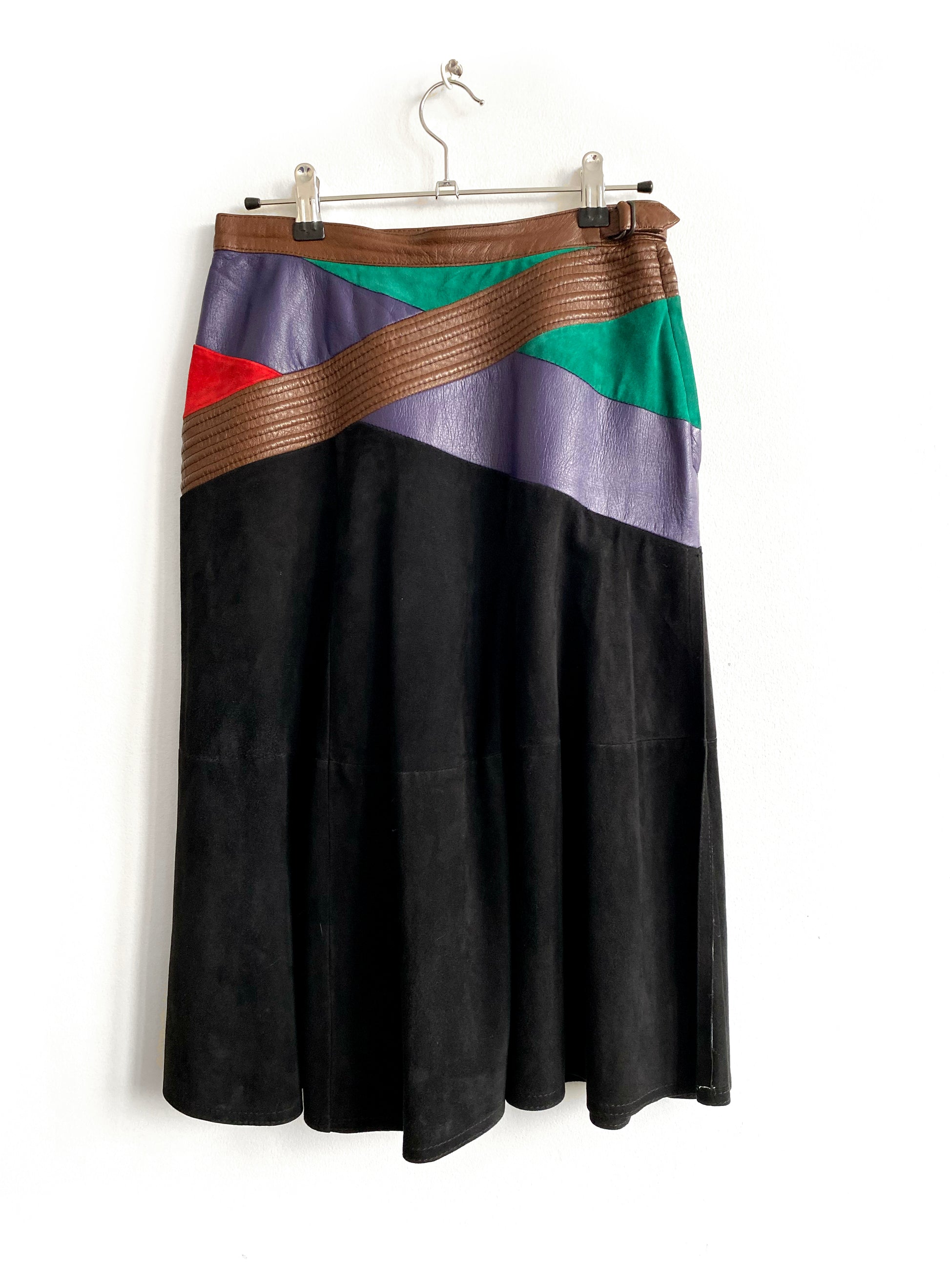 Mid-length flared skirt with suede and leather stitched inserts, circa 1985.