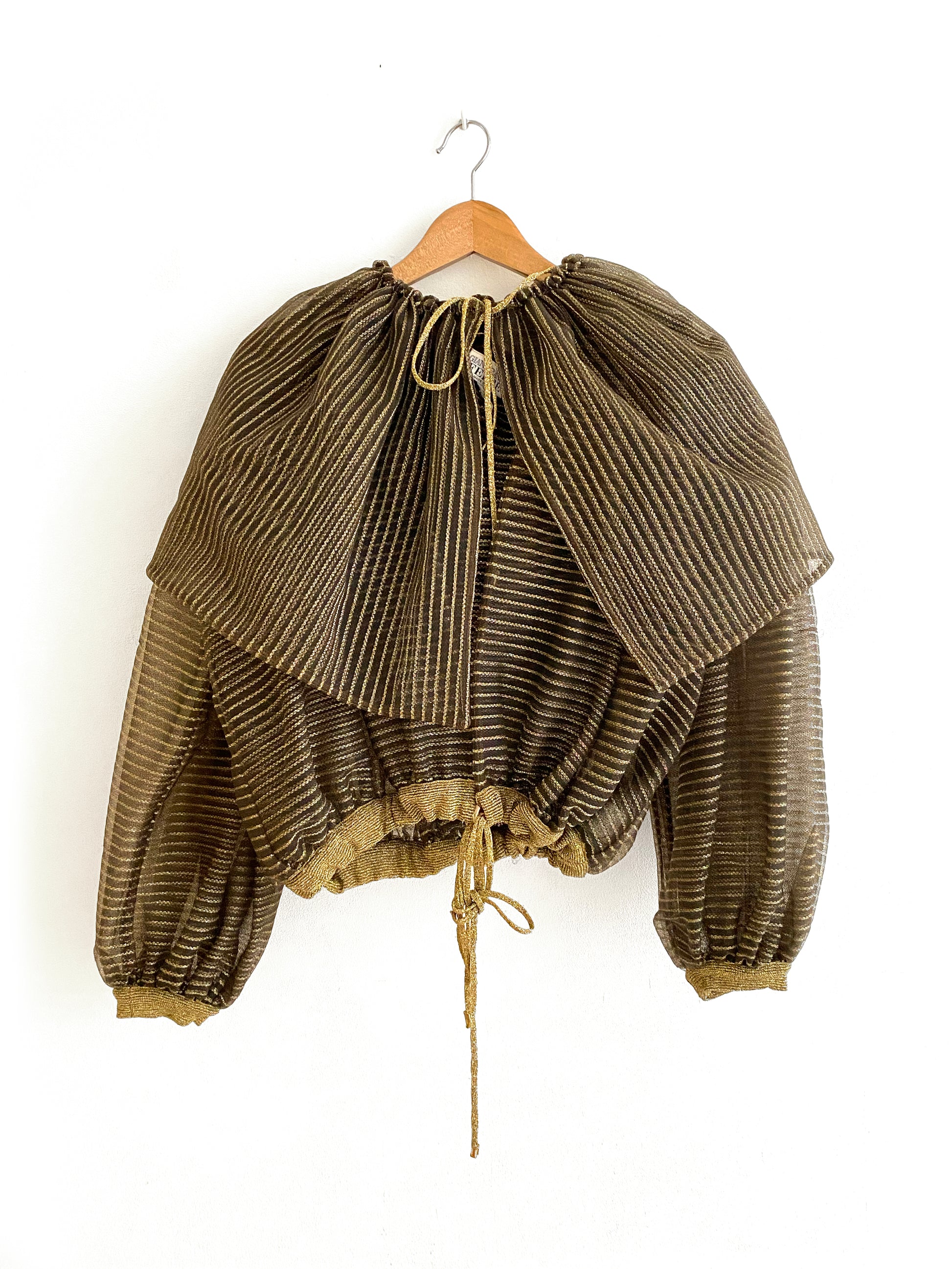 Double layering short jacket with drawstring waist closure, puffed sleeves, removable gathered hood, circa 1990.