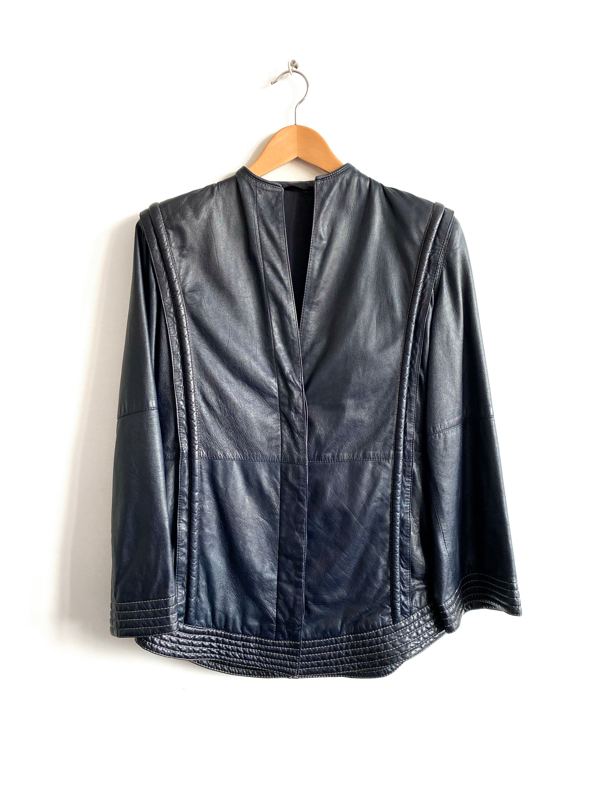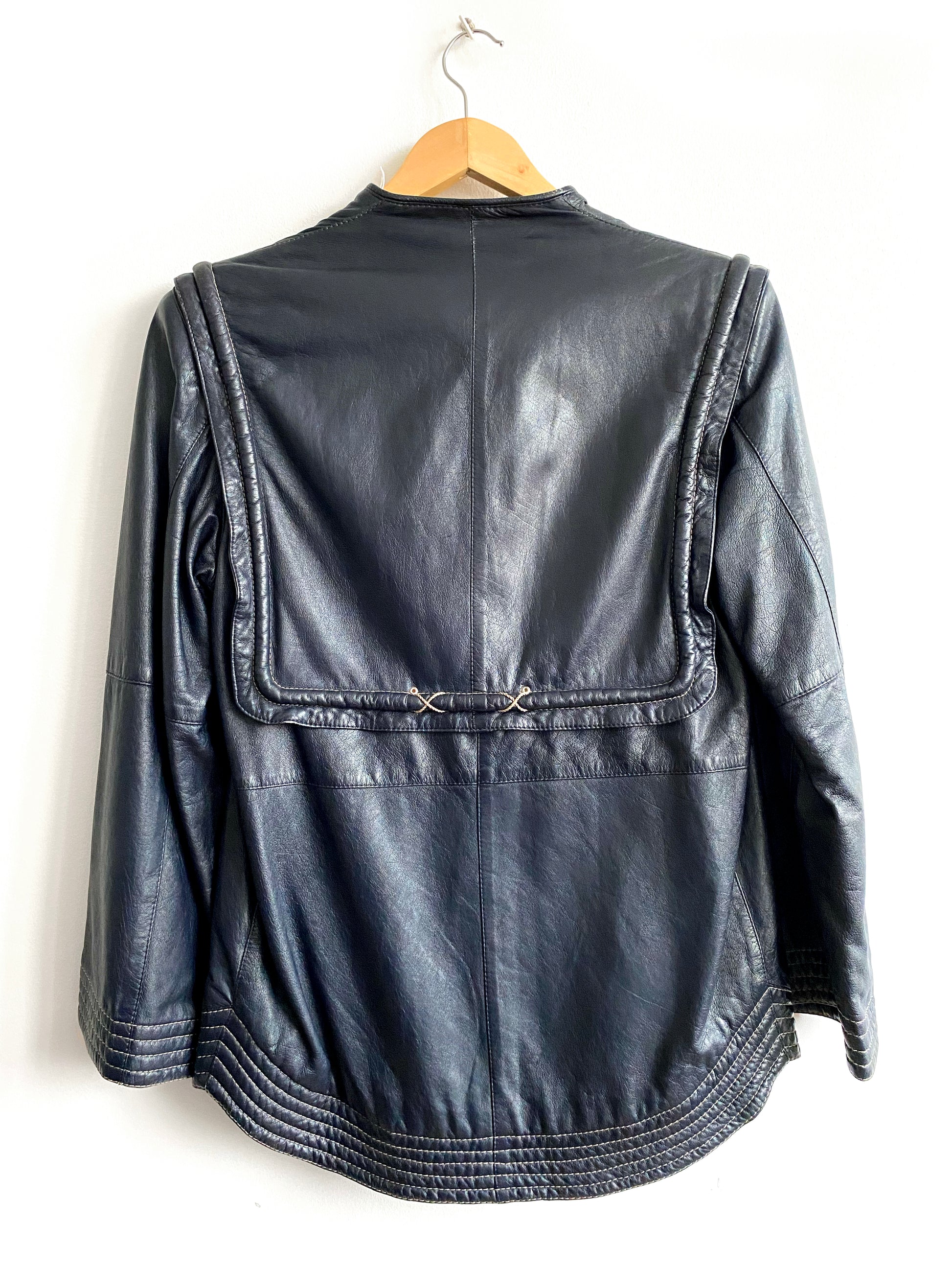 Navy blue leather shoulder jacket, contrasting stitching, side seams pockets.