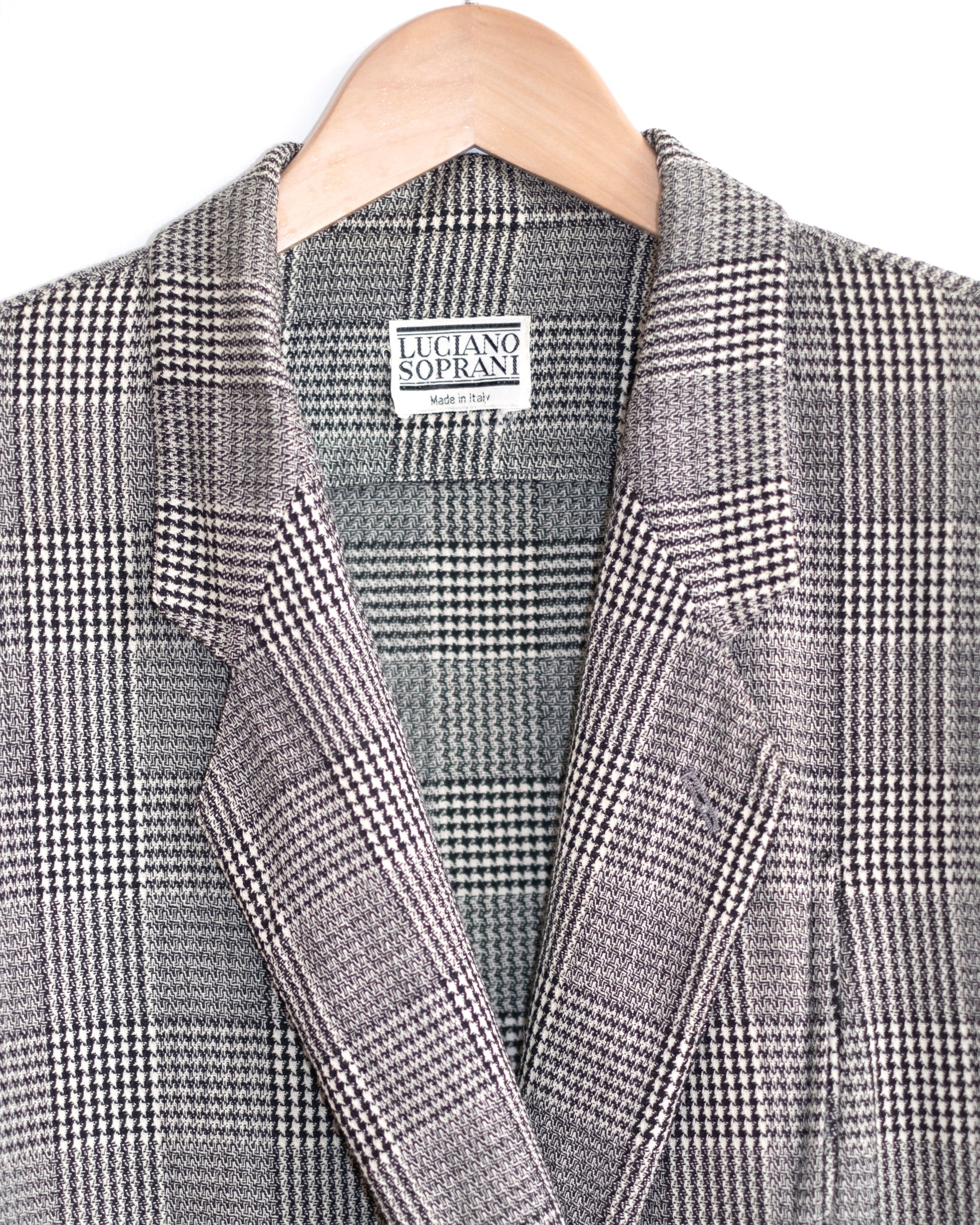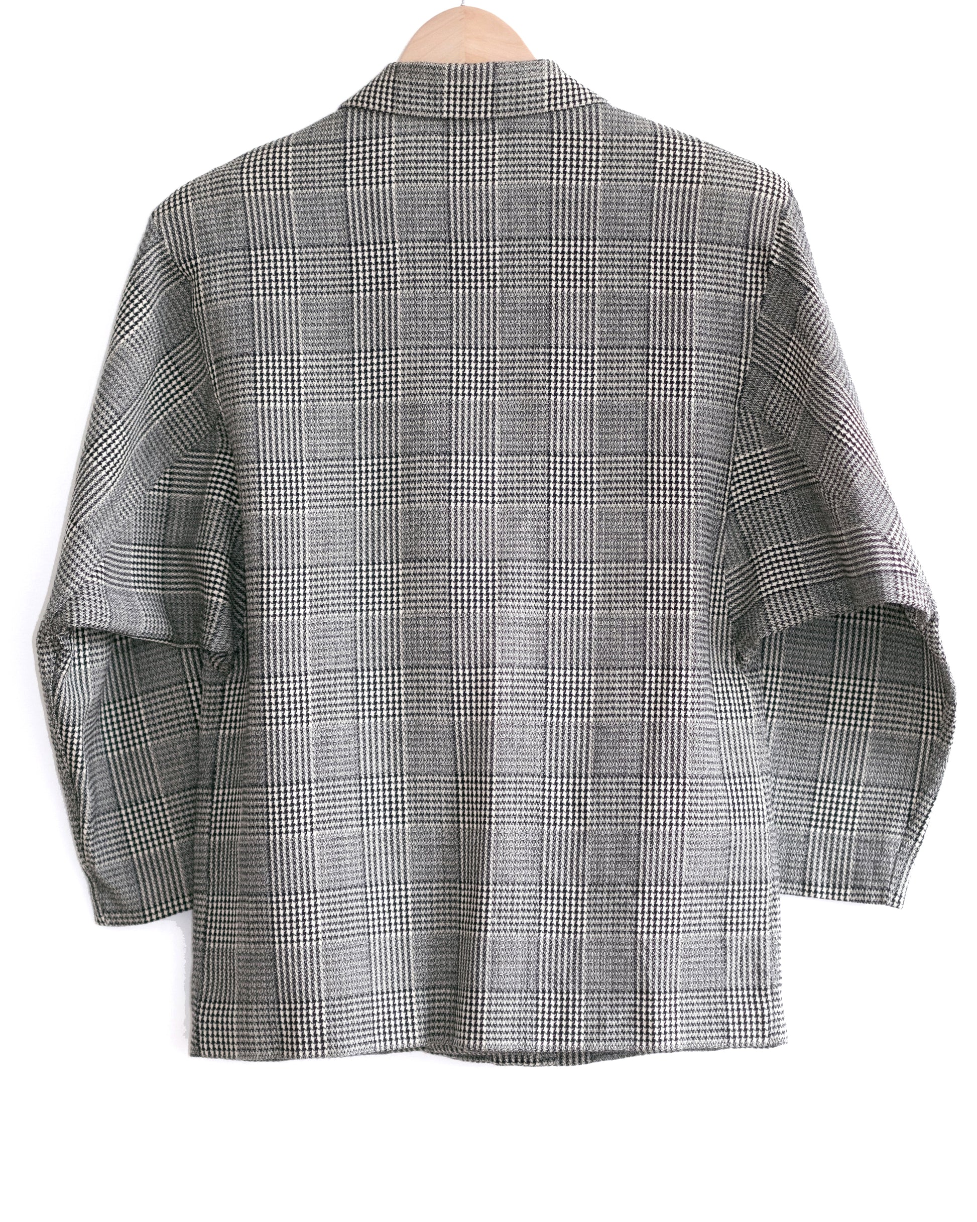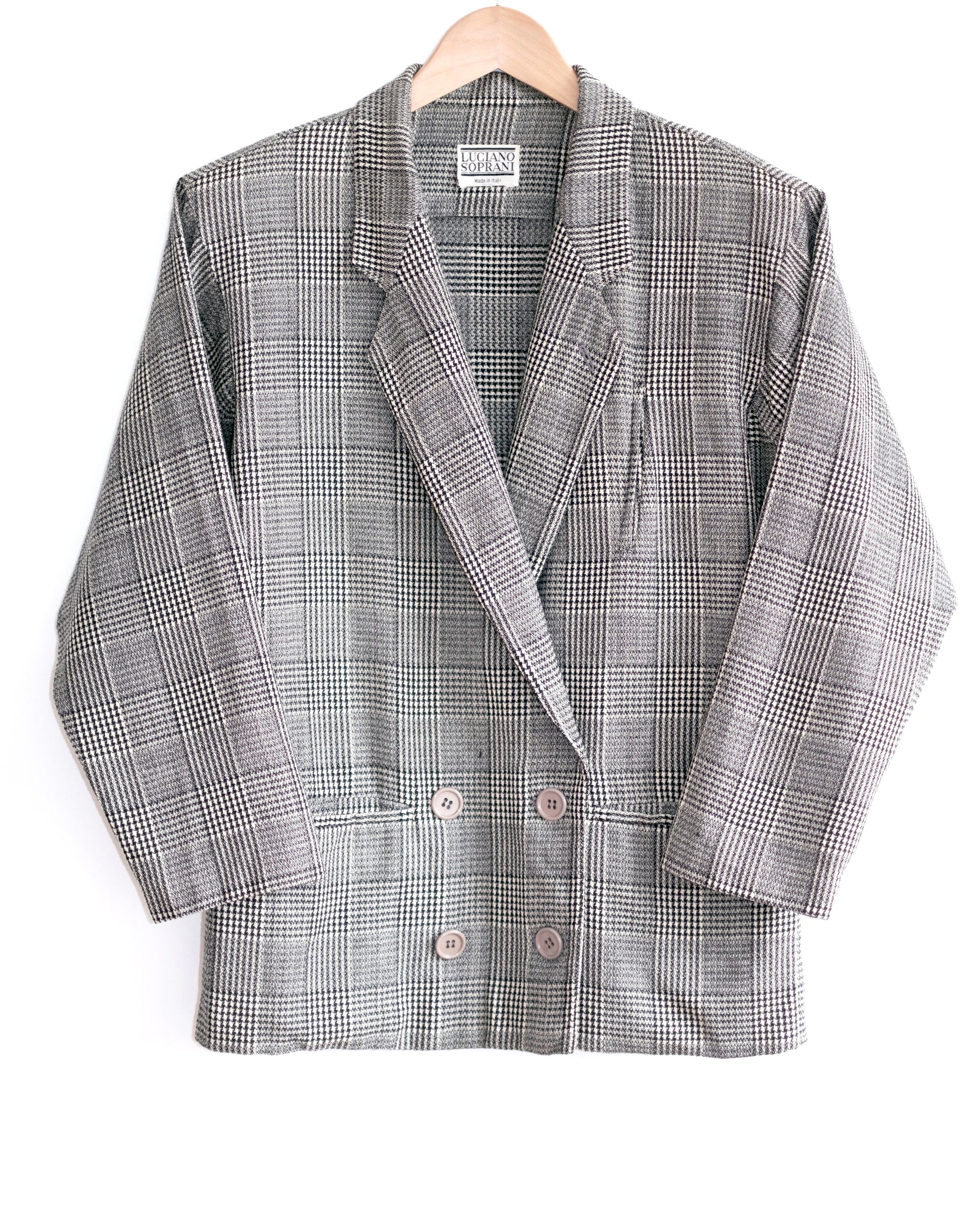 Double breasted Prince of Wales blazer with shoulder pads and besom pockets, kimono sleeves, no lining c.1985