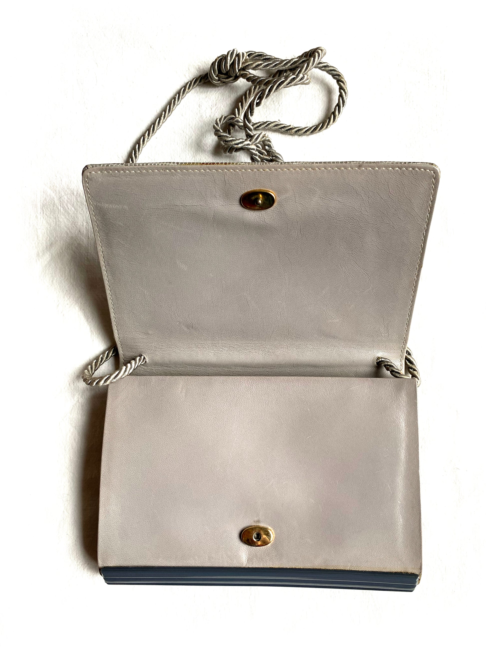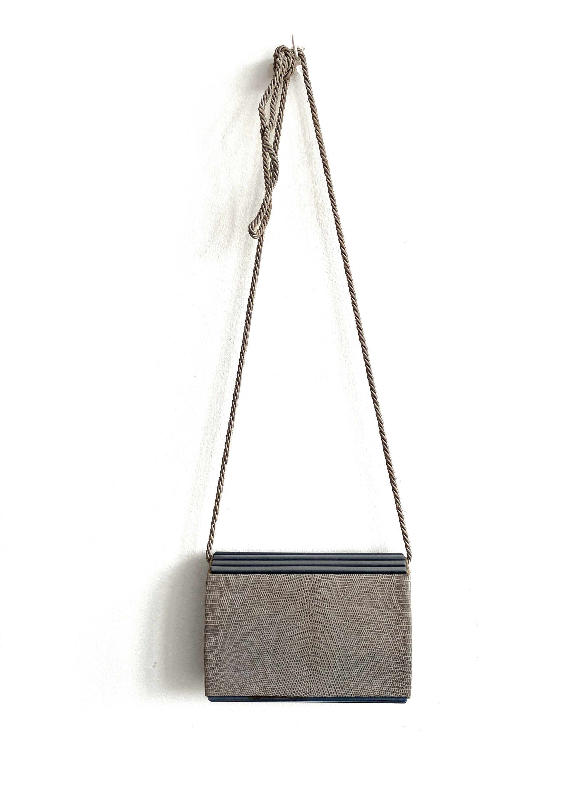 Mario Valentino small flap bag, grey reptile and smooth leather, articulated resin parts, cord strap, snap closure, circa 1975.