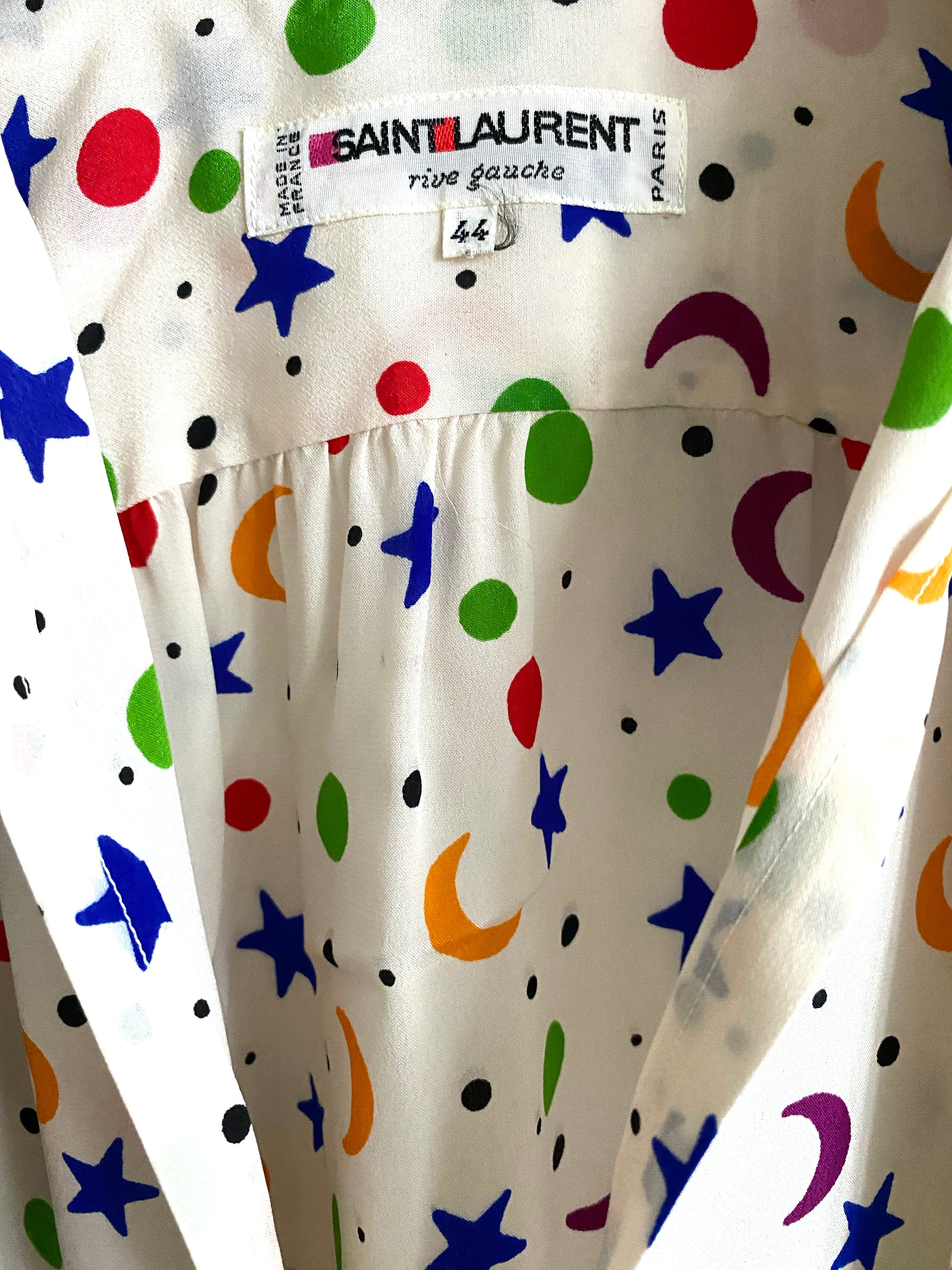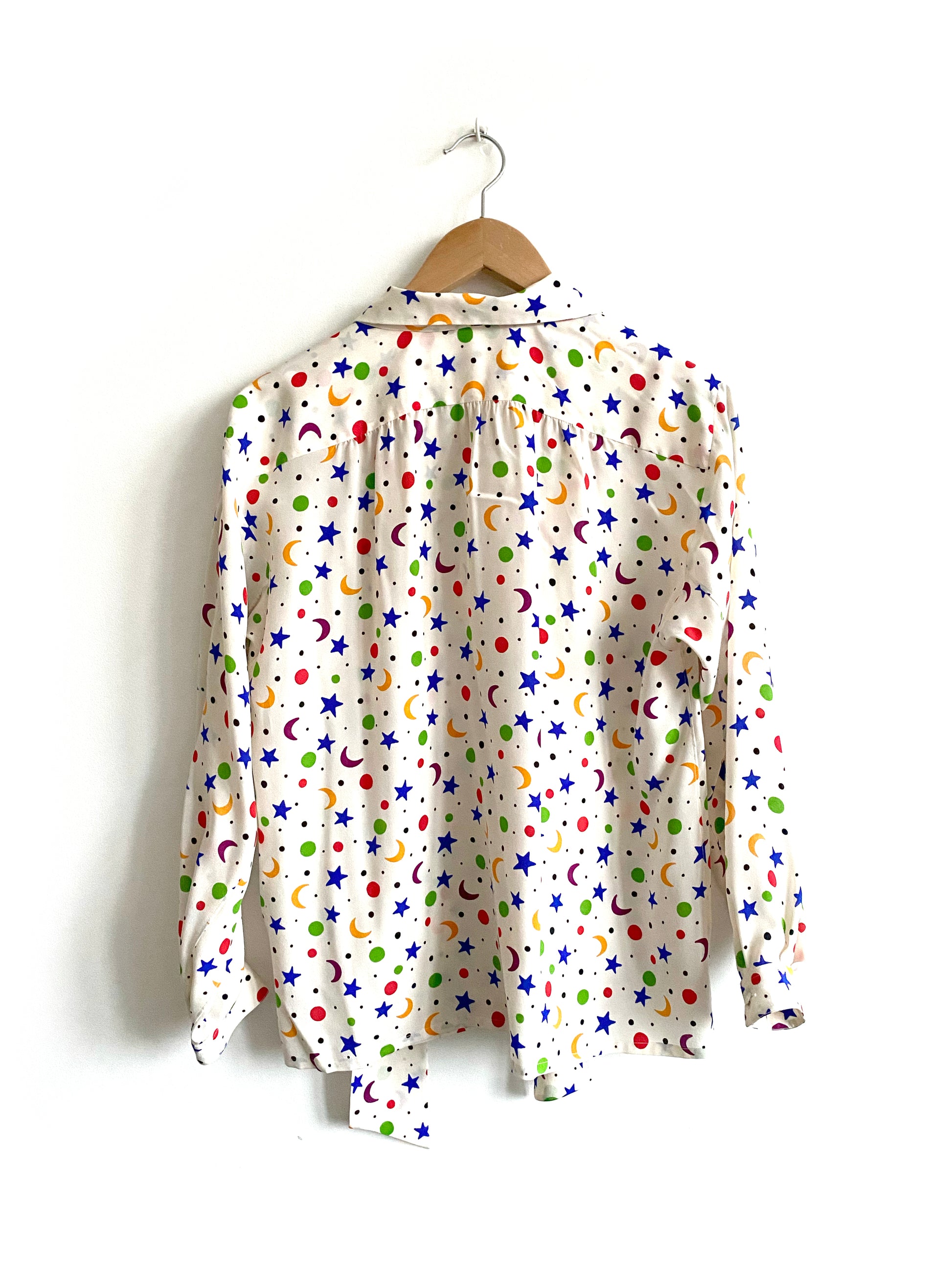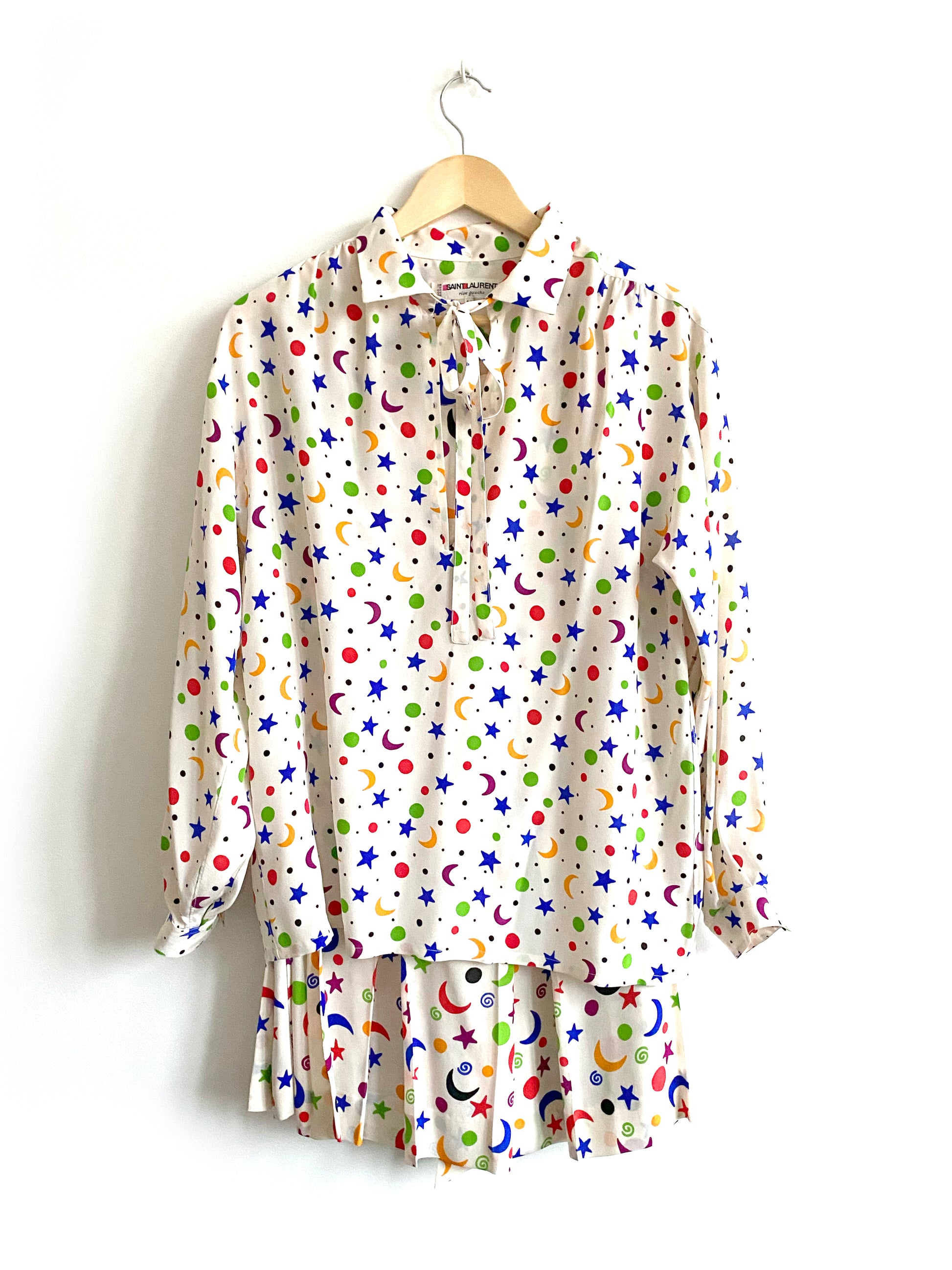 Moon and stars printed two pieces silk set, square cut polo neck shirt with removable lavallière, classic pleated skirt, 1979.