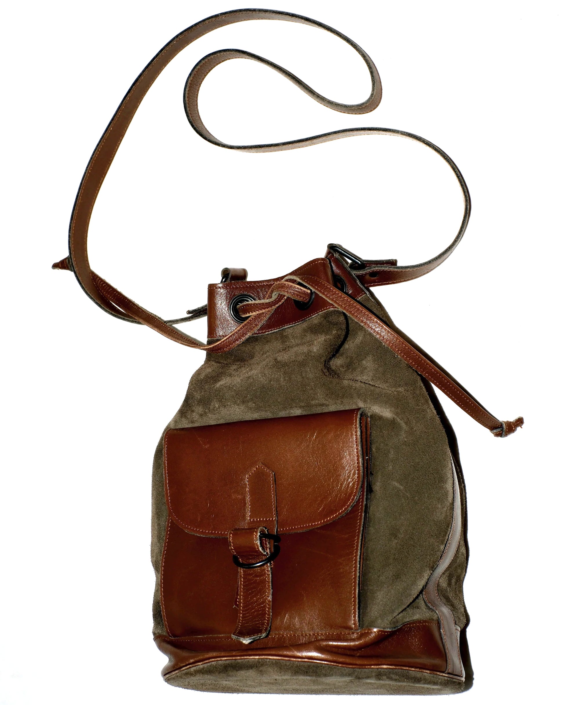 Description: drawstring, small leather purse at the front, leather trimming, c.1978