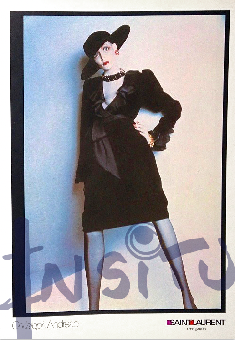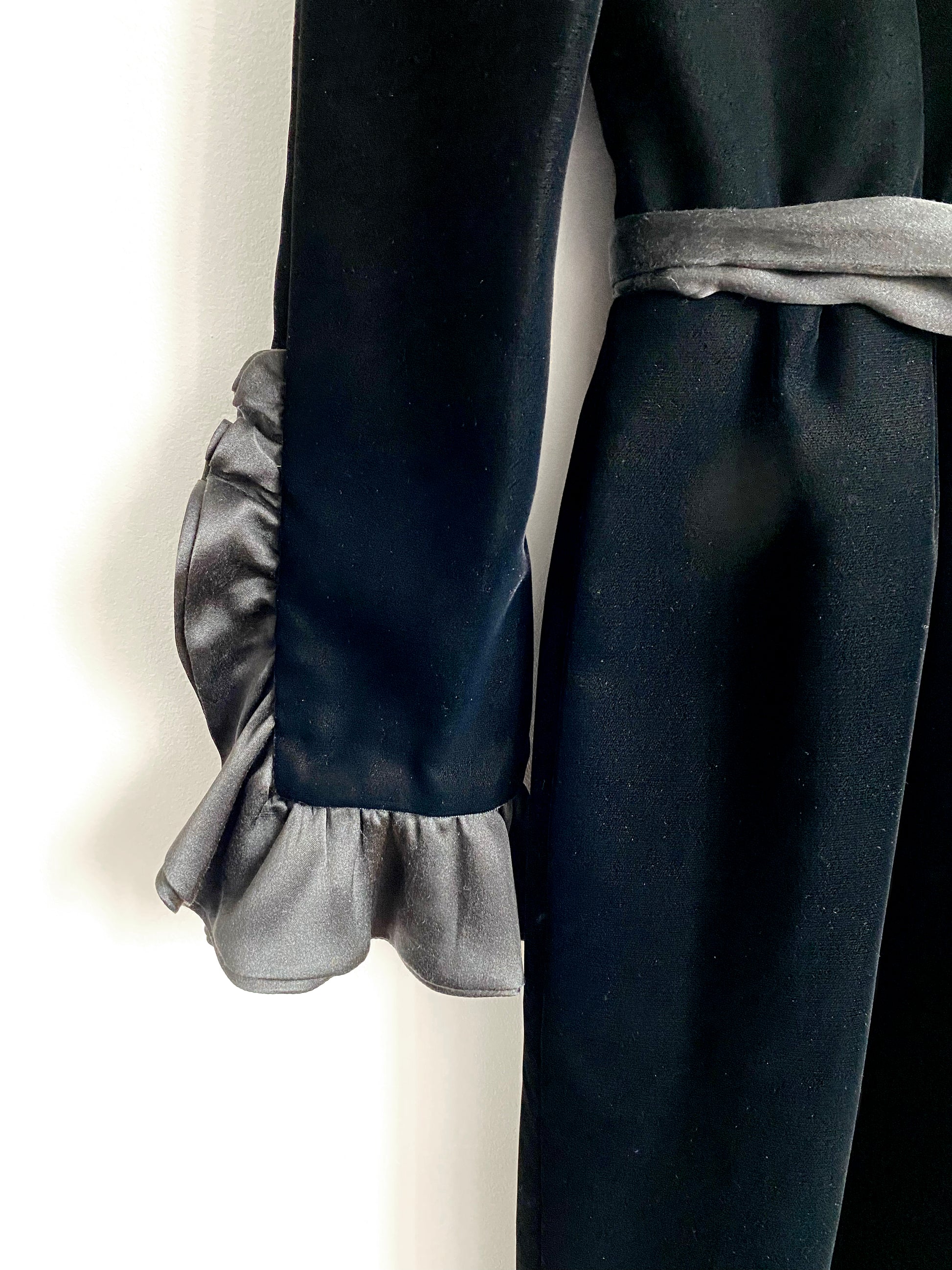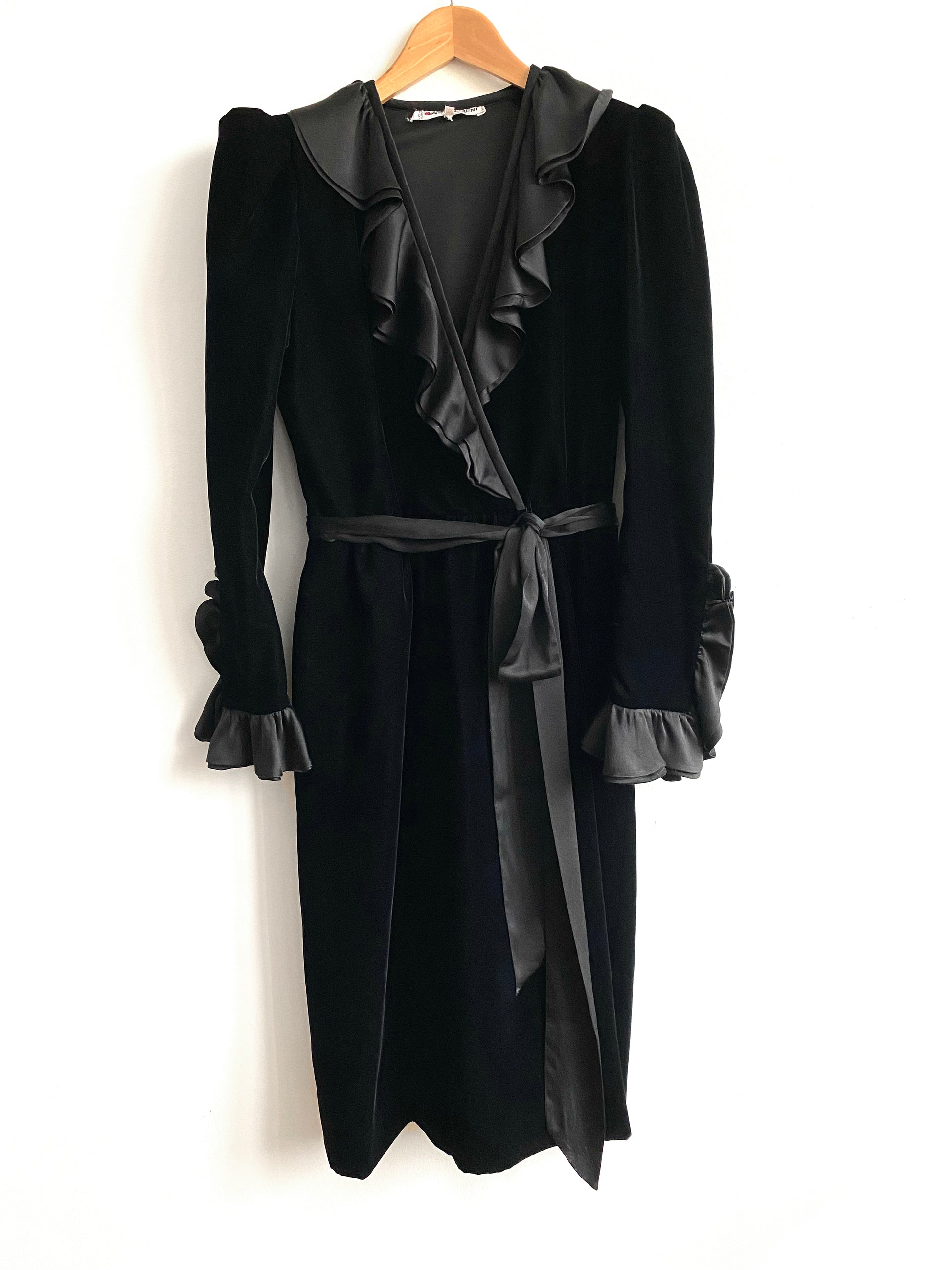Velvet wrap dress, satin ruffled hem and collar, satin matching belt to tie, 1982.