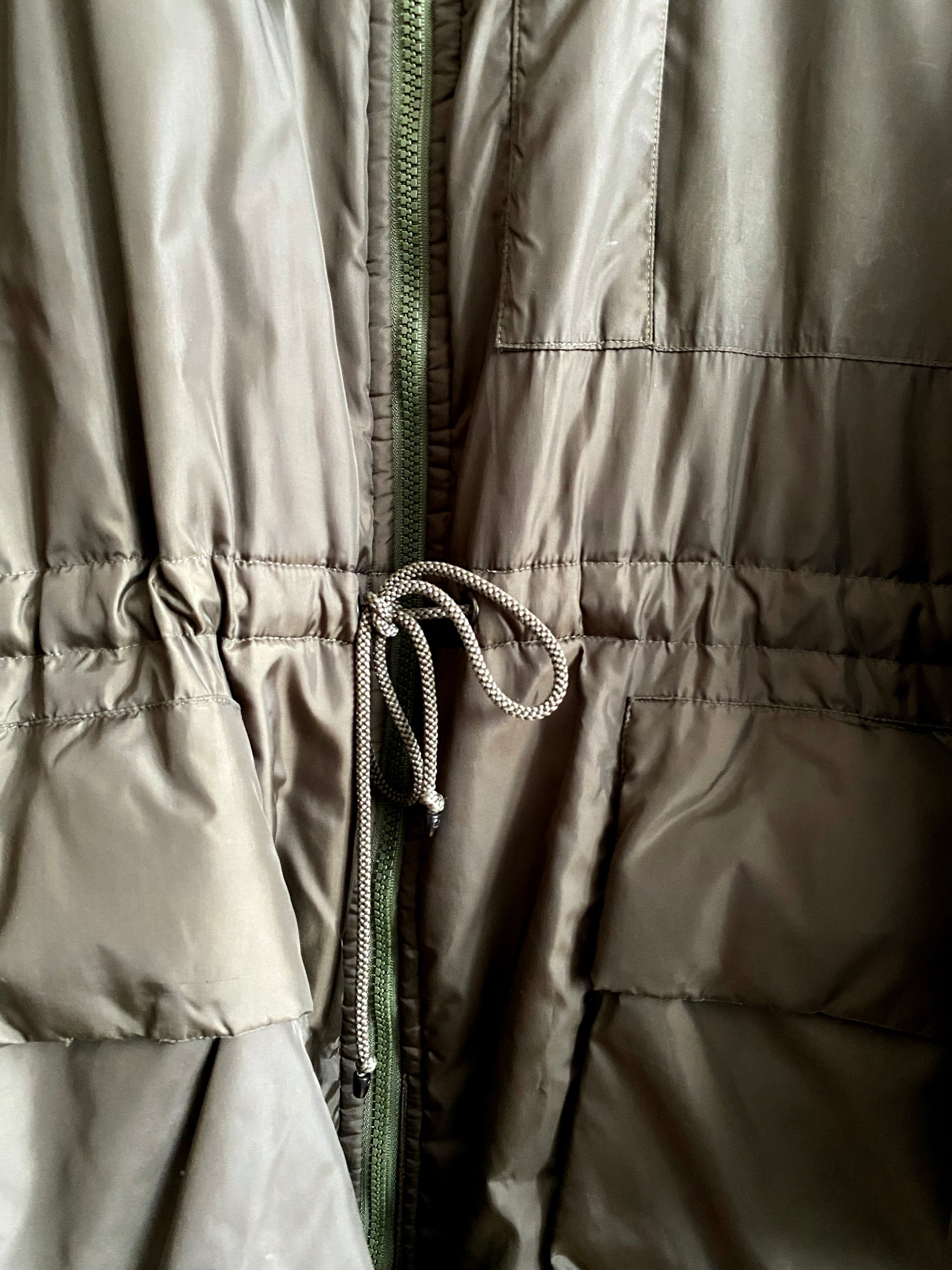 Long, thin down jacket, drawstring waist, giant back pocket, circa 1990